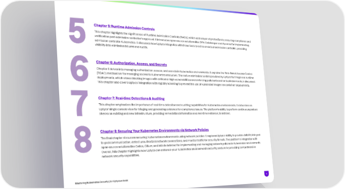 Chapter 5: Runtime Admission Controls This chapter highlights the significance of Runtime Admission Controls (RACs), which add a layer of protection by ensuring compliance and verification post-admission controller's approval. It introduces open-source solutions like OPA Gatekeeper and Kyverno for implementing 5admission control in Kubernetes. It discusses how Uptycs integrates with these tools to act as an actual admission controller, providing visibility into admission failures and audits. Chapter 6: Authorization, Access, and Secrets Chapter 6 delves into managing authorization, access, and secrets in Kubernetes environments. It explains the Role-Based Access Control (RBAC) mechanism for managing access to Kubernetes resources. The native admission control provided by Uptycs for image and runtime 6deployments, which allows blocking images with critical or high vulnerabilities and enforcing policies based on business needs, is discussed. This chapter also covers Uptycs' integration with registry scanning to prevent the use of vulnerable images for container deployments. Chapter 7: Real-time Detections & Auditing This chapter emphasizes the importance of real-time detection and auditing capabilities for Kubernetes environments. It elaborates on Uptycs' single console view for triaging and generating evidence for compliance issues. The platform's ability to perform continuous posture 7 checks on existing and new infrastructure, providing remediation information and real-time evidence, is detailed. Chapter 8: Securing Your Kubernetes Environments via Network Policies The final chapter discusses securing Kubernetes environments using network policies. It explores Uptycs' ability to provide visibility into pod- to-pod communication, detect unauthorized network connections, and monitor traffic for security threats. The platform's integration with 8open-source solutions like Calico, Cilium, and Istio is detailed for implementing and managing network policies in Kubernetes environments. Overall, this chapter highlights how Uptycs can enhance your Kubernetes environment's security posture by providing comprehensive network security capabilities. Mastering Kubernetes Security | An Uptycs e-book 4